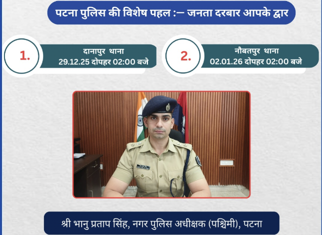 जानकारी के अनुसार, जनता दरबार का आयोजन 29 दिसंबर 2025 को दानापुर थाना परिसर तथा 02 जनवरी 2026 को नौबतपुर थाना परिसर में किया जाएगा। दोनों ही कार्यक्रम दोपहर 02:00 बजे से शुरू होंगे।