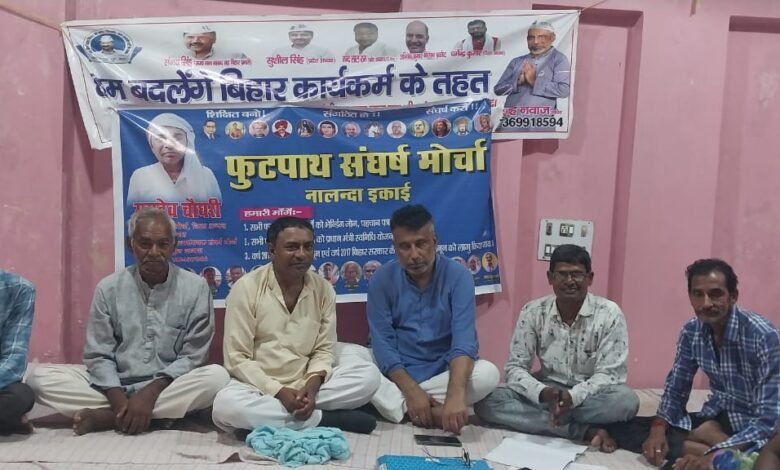 बैठक में वेंडिंग जोन, स्थाई जगह, पहचान पत्र, प्रधानमंत्री स्वनिधि योजना पर चर्चा की गई। बैठक को संबोधित करते हुए फुटपाथ संघर्ष मोर्चा के जिला अध्यक्ष रामदेव चौधरी ने कहा कि बिहारशरीफ को स्मार्ट सिटी बनाया जा रहा है लेकिन दूसरे तरफ इस स्मार्ट सिटी में स्थाई जगह चिंतित करते हुए सर्वे किए गए बिहारशरीफ के फुटपाथ दुकानदारों को आज तक एक भी वेंडिंग जोन बनाकर नहीं दिया गया है। वेडिंग जोन के नाम पर आज तक बिहारशरीफ के फुटपाथ दुकानदारों को सरकार द्वारा आश्वासन के सिवा कुछ नहीं मिला। केंद्र सरकार द्वारा 2014 के बने पथ कानून को अभी तक पूर्ण रूप से धरातल पर उतरा नहीं गया है बिहार सरकार द्वारा 2017 में बने पथ कानून को अभी तक पूर्ण रूप से लागू नहीं किया गया है। बिहारशरीफ के बाजार समिति में बने शैड में फुटपाथ दुकानदारों को बसाने का काम सरकार करें। पीएम स्वनिधि स्कीमः- देश के उन करोड़ों रेडी पटरी वालों के लिए एक बहुत बड़ी राहत भरी खबर आई है, जो दिन रात मेहनत करके शहरों की सड़कों पर हमारी और आपकी ज़रूरतें पूरी करते हैं। प्रधानमंत्री की अध्यक्षता में हुई केंद्रीय कैबिनेट की बैठक में पीएम स्वनिधि योजना को लेकर एक ऐतिहासिक फैसला लिया गया है। पहला लोन:-अब तक पहली बार में 10000 का लोन मिलता था अब इसे बढ़ाकर 15000 कर दिया गया है। दूसरा लोन:-पहला लोन समय पर चुकाने के बाद दूसरा लोन की राशि को 20000 से बढ़कर 25000 कर दिया गया है। तीसरा लोन:- तीसरे लोन की राशि पहले की तरह ही 50000 रहेगी। कोई भी व्यक्ति जो शहरो या कास्बों में रेडी पटरी पर सामान बेचकर (जैसे सब्जीवाला, फलवाला, चार्टवाला) आदि अपने आजीविका चलता है वह इस योजना के लिए आवेदन कर सकता है। यह इस योजना का सबसे क्रांतिकारी कदम है जो लाभार्थी अपना दूसरा लोन सफलतापूर्वक चुका देंगे उन्हें अब बैंकों की तरफ से UP- लिक्ड रुपे क्रेडिट कार्ड पाने के पात्र होंगे। इससे उन्हें अचानक पड़ने वाली व्यापारिक एवं व्यक्तिगत जरूरत के लिए तुरंत पैसा मिल सकेगा अब उन्हें किसी के आगे हाथ फैलाने की जरूरत नहीं पड़ेगी।आप किसी भी सरकारी बैंक नजदीकी कॉमन सर्विस सेंटर(CSC) या नगर पालिका कार्यालय में जाकर इस योजना के लिए आवेदन कर सकते हैं।आप पीएम स्वनिधि के मोबाइल एप या आधिकारिक पोर्टल के माध्यम से भी कर सकते हैं। बैठक किया अध्यक्षता फुटपाथ संघर्ष मोर्चा के जिला महासचिव महेंद्र प्रसाद ने की। इस बैठक में सामाजिक कार्यकर्ता उमेश पंडित अवधेश प्रसाद शाहनवाज फुटपाथ संघर्ष मोर्चा के जिला कोषाध्यक्ष मुन्ना शर्मा जिला कमेटी सदस्य मिथिलेश वर्मा अजीत कुमार मोहम्मद आजाद एम एम अलम सीमा देवी आदि दर्जनों लोग उपस्थित थे